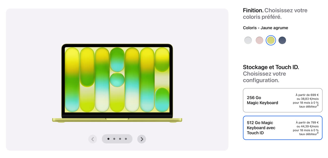 Le MacBook Neo ne se contente pas de reprendre la puce d’un iPhone, il adopte aussi son organisation de la gamme. Il n’y a que deux options à choisir pour acheter cet ordinateur : la couleur et l’espace de stockage. Quatre coloris différents sont proposés, avec trois vraies teintes qui s’ajoutent à la couleur naturelle de l’aluminium : indigo, rose poudré et le jaune agrume que l’on voit partout et qui est indéniablement le choix le plus frappant. Le MacBook Neo est vendu par défaut avec un SSD de 256 Go pour 699 € et on peut doubler le stockage pour passer à 512 Go contre 799 €.
