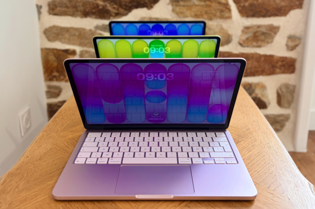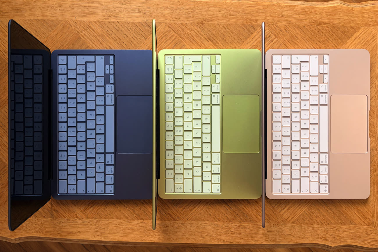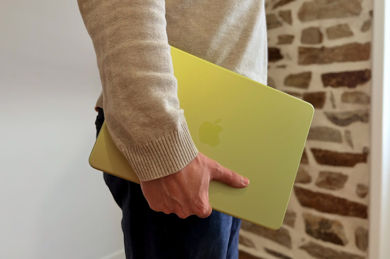 L’argent est le même aluminium sans coloration que l’on croise dans le catalogue depuis maintenant plus de vingt ans. Pour le reste, on a le choix entre l’indigo, un bleu qui est foncé, mais sans aller autant vers le noir comme le coloris minuit du MacBook Air ; le rose poudré, assez subtil tout en restant bien visible avec des tons dorés selon l’angle ; et le jaune agrume. C’est sans conteste la star de la gamme, celui qui se distingue le plus et c’est à mon avis une franche réussite. Les goûts et les couleurs ne se discutent pas et je dois souligner que les photos ont du mal à rendre justice à cette teinte qui change constamment, entre jaune qui tend au doré et vert parfois façon pomme Granny.