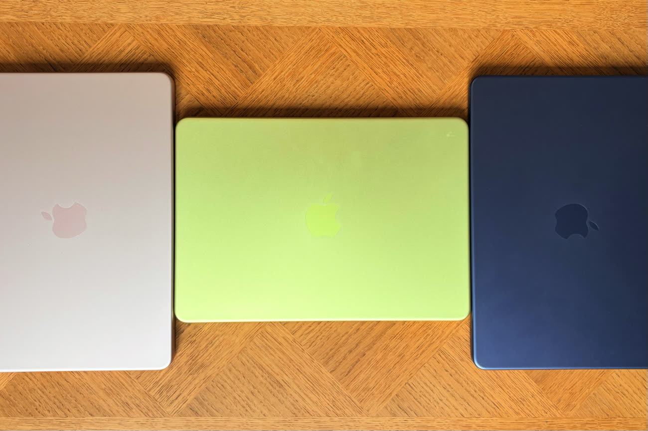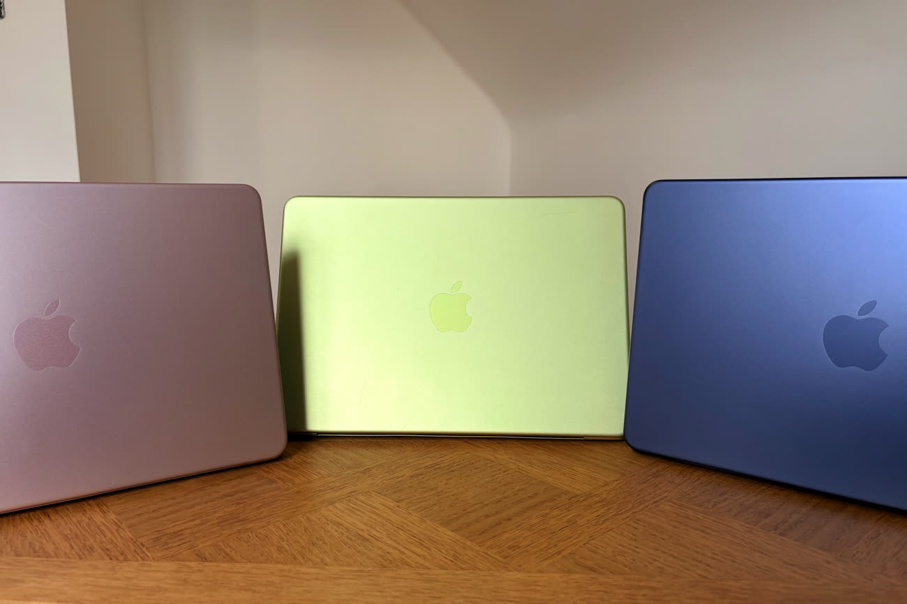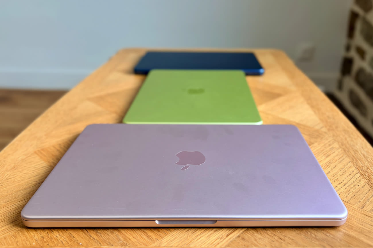 L’argent est le même aluminium sans coloration que l’on croise dans le catalogue depuis maintenant plus de vingt ans. Pour le reste, on a le choix entre l’indigo, un bleu qui est foncé, mais sans aller autant vers le noir comme le coloris minuit du MacBook Air ; le rose poudré, assez subtil tout en restant bien visible avec des tons dorés selon l’angle ; et le jaune agrume. C’est sans conteste la star de la gamme, celui qui se distingue le plus et c’est à mon avis une franche réussite. Les goûts et les couleurs ne se discutent pas et je dois souligner que les photos ont du mal à rendre justice à cette teinte qui change constamment, entre jaune qui tend au doré et vert parfois façon pomme Granny.